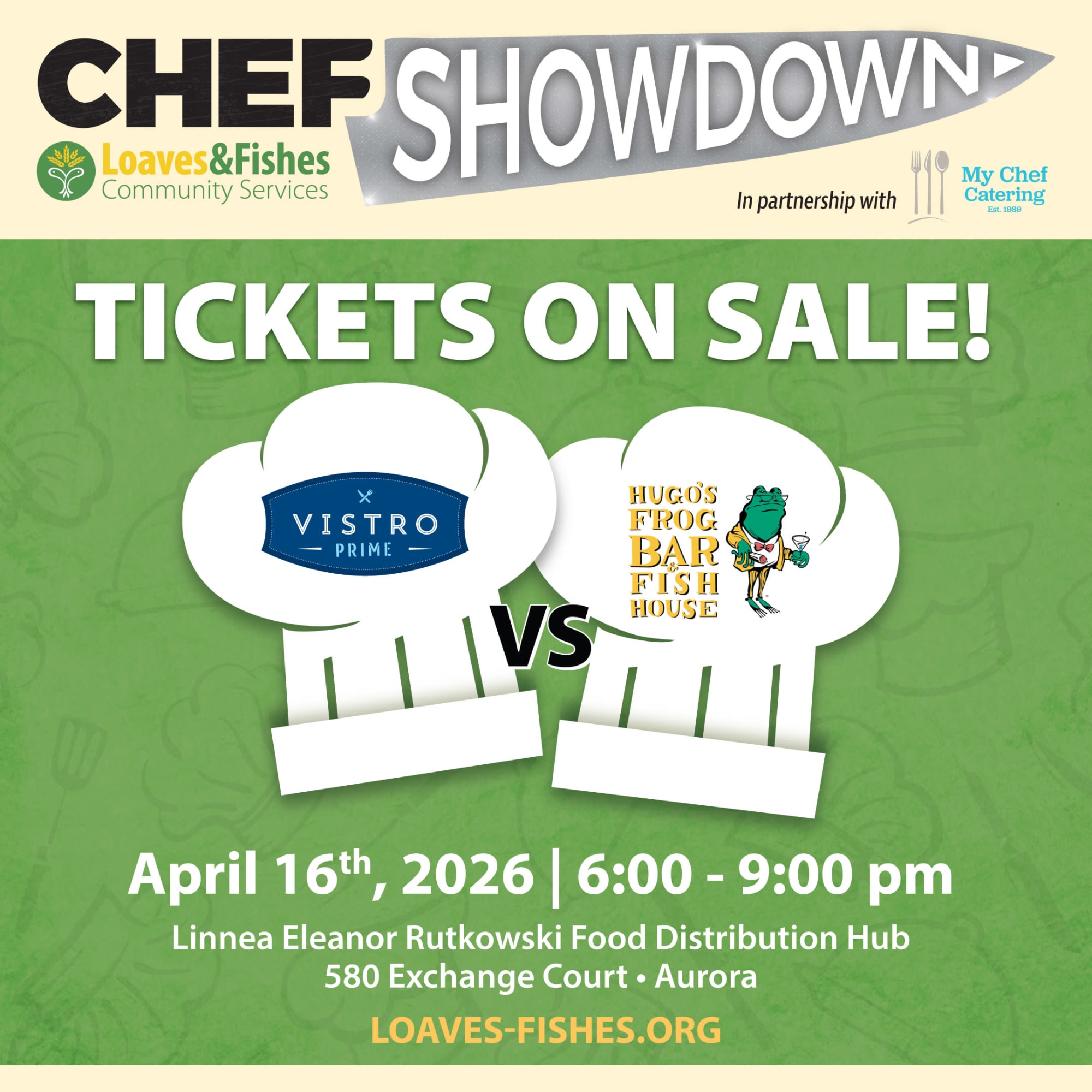 The Culinary Event of the Season, Loaves & Fishes Chef Showdown This year’s competition will showcase executive chefs from local restaurants, Vistro Prime of Hinsdale and Hugos Frog Bar & Fish House - Naperville. These talented chefs will compete to create unique dishes in a professional stadium kitchen, with a distinguished panel of community leaders judging to crown the winner! Best of all, this unforgettable evening raises critical funds to support families facing hunger in our community.
